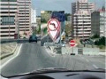 1.A mudança de direcção é obrigatória. 2.É proibido mudar de direcção à esquerda. Resposta: É proibido mudar de direcção à esquerda. Explicação: De acordo com a imagem (esta foi sujeita a tratamento gráfico, ampliando-se os sinais mais distantes), perante a sinalização, estou proibido de mudar de direcção à esquerda, sendo que a mudança de direcção não é obrigatória, pois não existe nenhum sinal de obrigação. Existe, isso sim, um sinal de proibição - sentido proibido - que me impede de circular no sentido do trânsito para o qual o sinal está orientado. Mas atenção: Este sinal é apenas um factor de diversão que não explica a proibição de virar à esquerda! Esta proibição prescrita por um dos sinais mais distantes deriva das caracterÃsticas da via onde vou entrar, nomeadamente a existência de um separador central que divide os sentidos de trãnsito.